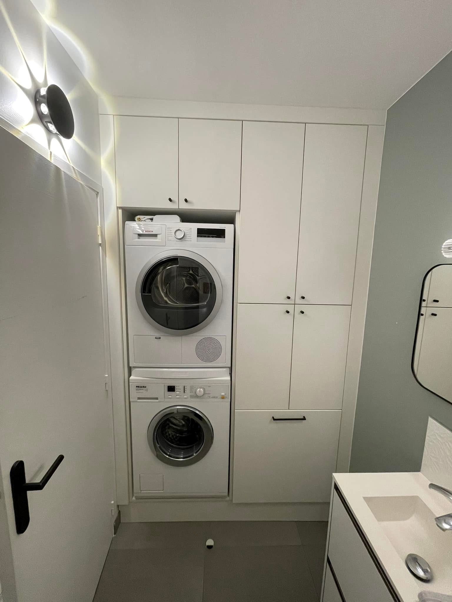 Un espace optimisé pour l’électroménager, permettant d’encastrer machine à laver et sèche-linge tout en conservant une esthétique harmonieuse.